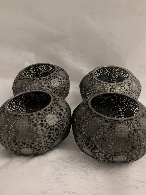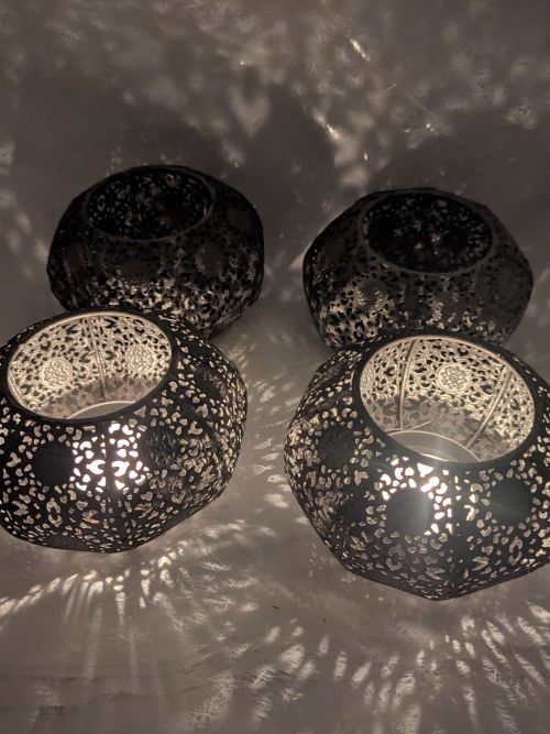 Ces photophores en métal ciselé diffusent une lumière douce et raffinée 🕯️.
