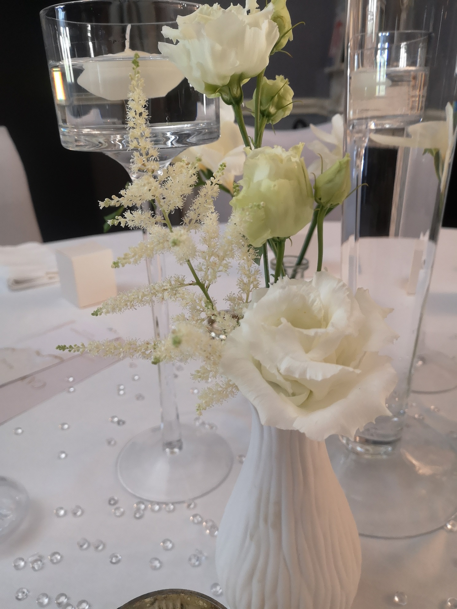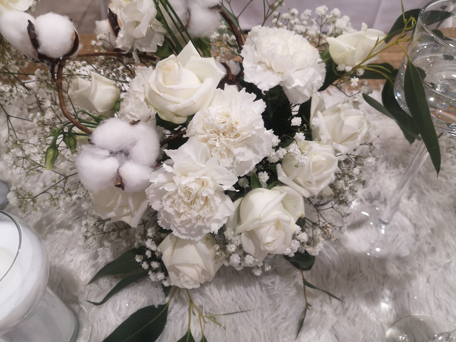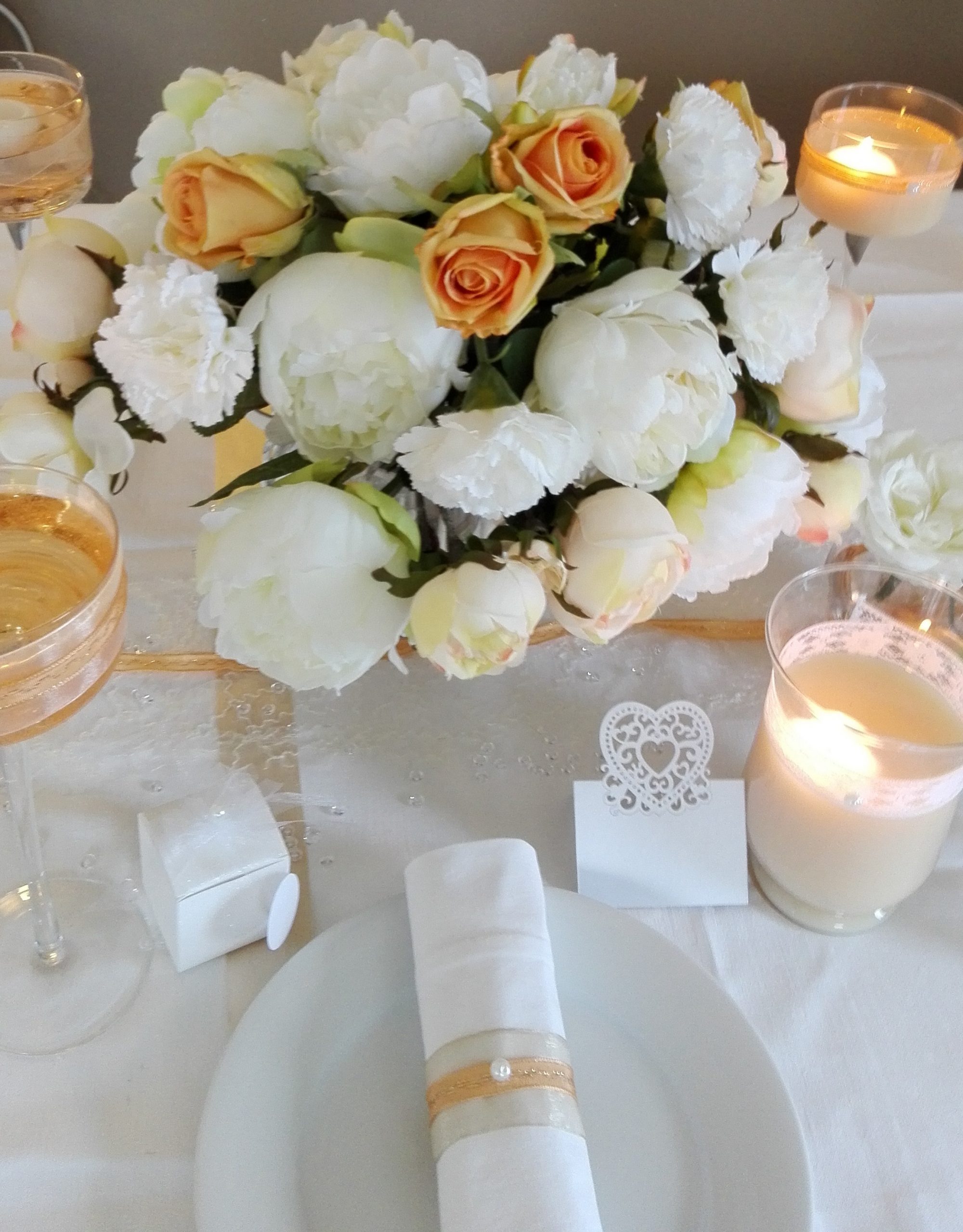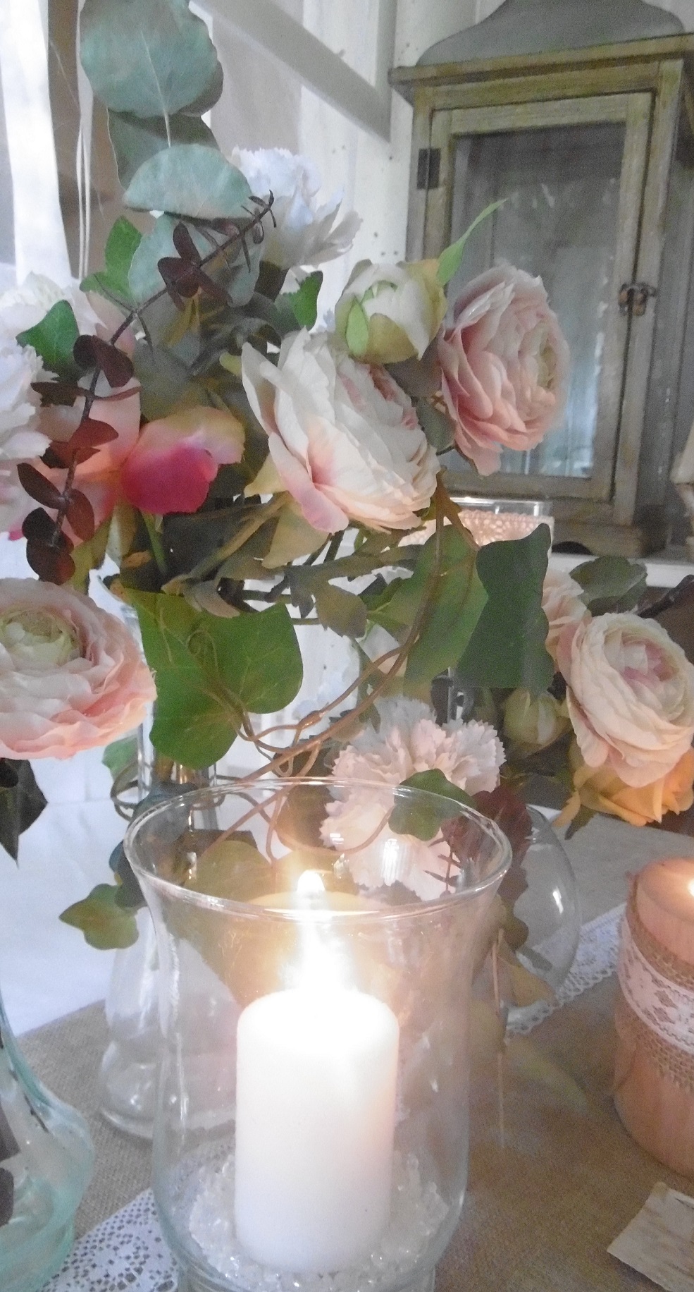 Romantique – Glamour… bouquet blanc œillet blanc rose blanche vase, dentelle gypsophile photophore romantique pivoine rose dav dav table d’honneur , table des mariés fleurs pêches rose blanche dav Des roses des bougies centre de table romantique bougie et photophore Bouquet de roses et retombé de feuillage Gros bouquet sur vase haut